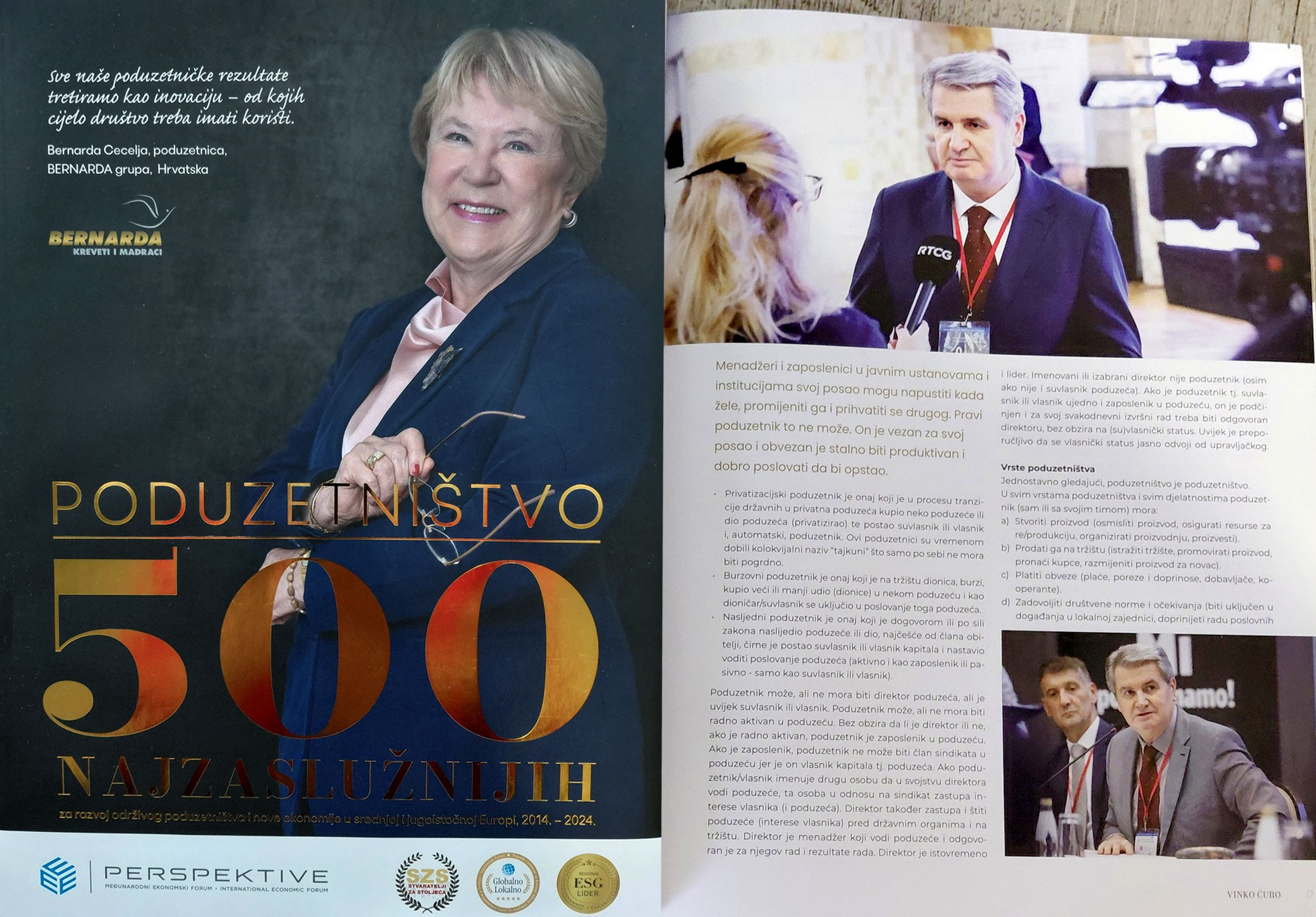 U nakladi Međunarodnog ekonomskog foruma „Perspektive“ i tvrtke „Promo global“ iz Zagreba, iz tiska je nedavno izišla monografija „Poduzetništvo – 500 najzaslužnijih za razvoj održivog poduzetništva i nove ekonomije u srednjoj i jugoistočnoj Europi“.